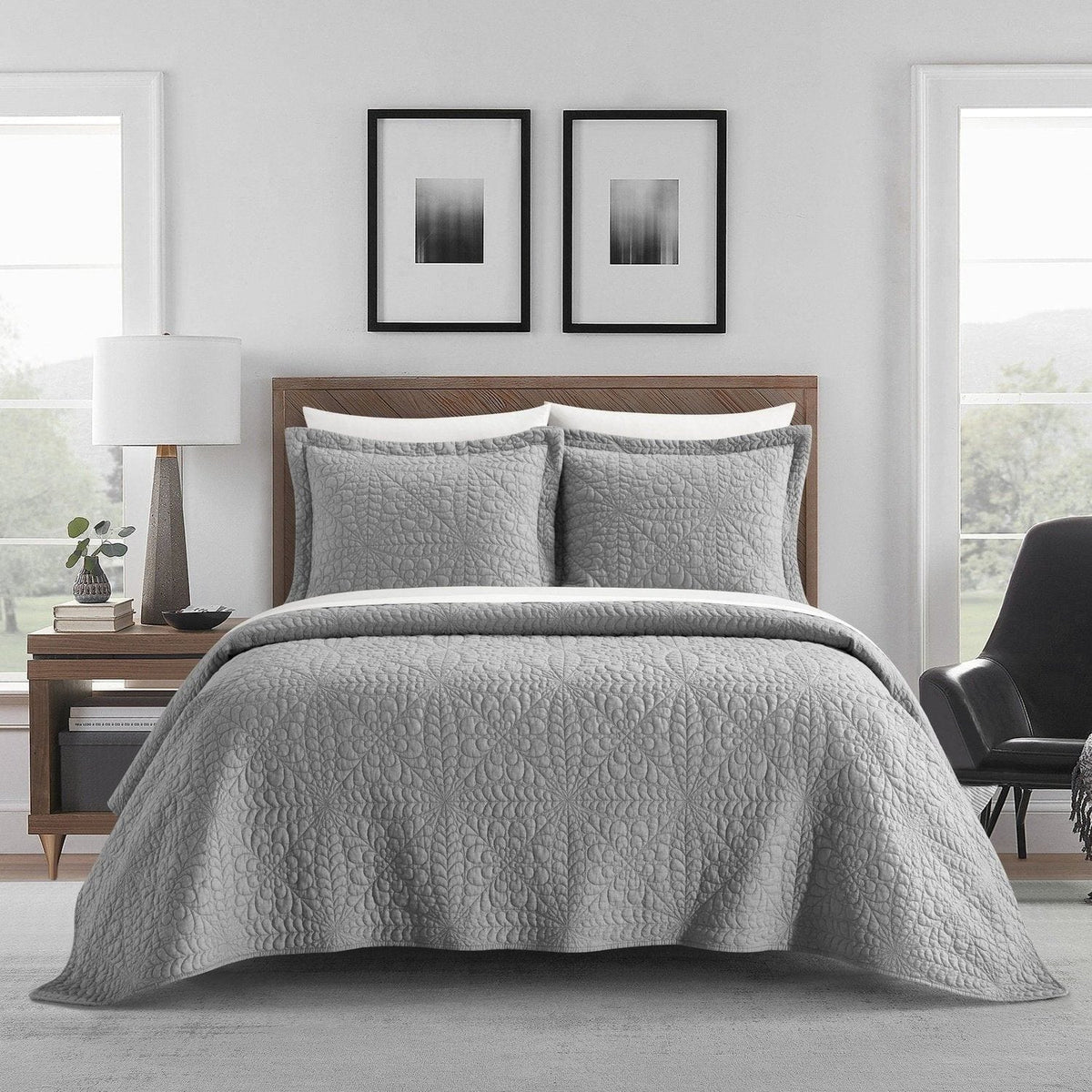 Embrace a laid back, natural vibe in your bedroom and turn it into a tranquil oasis you can truly escape to with our Babe quilt set. This set includes a stone washed cotton quilt as well as two shams in a solid color with an intricate stitched floral pattern that catches the eye while providing a soothing balance to a peaceful room.
