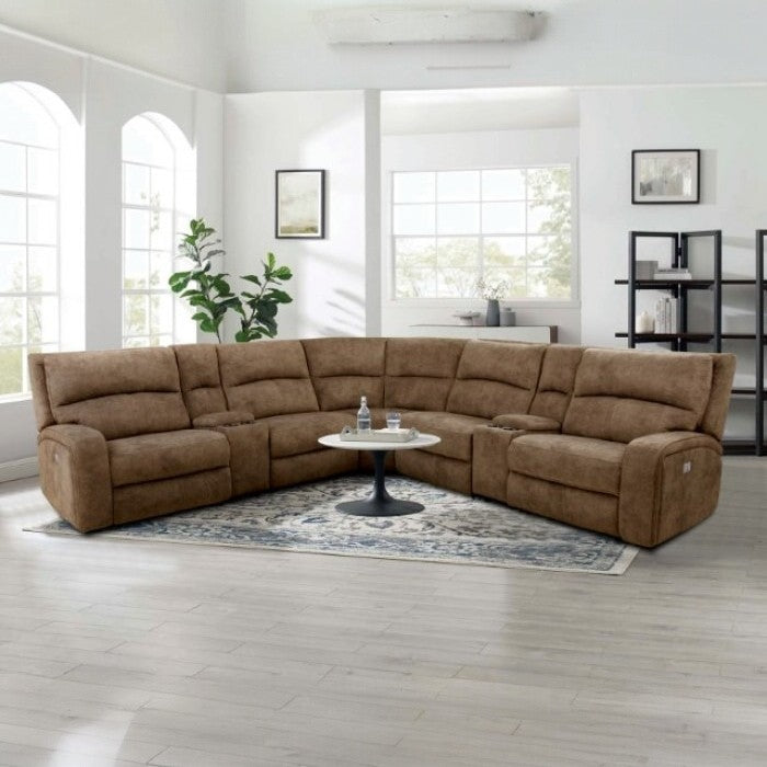 This highly attractive sectional will be the perfect centerpiece for your home. It's fully upholstered in soft fabric, from the cushions to the arms, and even the backs under the flaps. Underneath the plump stature is a solid kiln dried hardwood frame and no-sag suspension. Welcomed conveniences are staples here: multiple power-controlled recliners for the footrest and headrest, double storage consoles with cup holders and USB port for charging in a living room piece designed for your utmost comfort and convenience.
