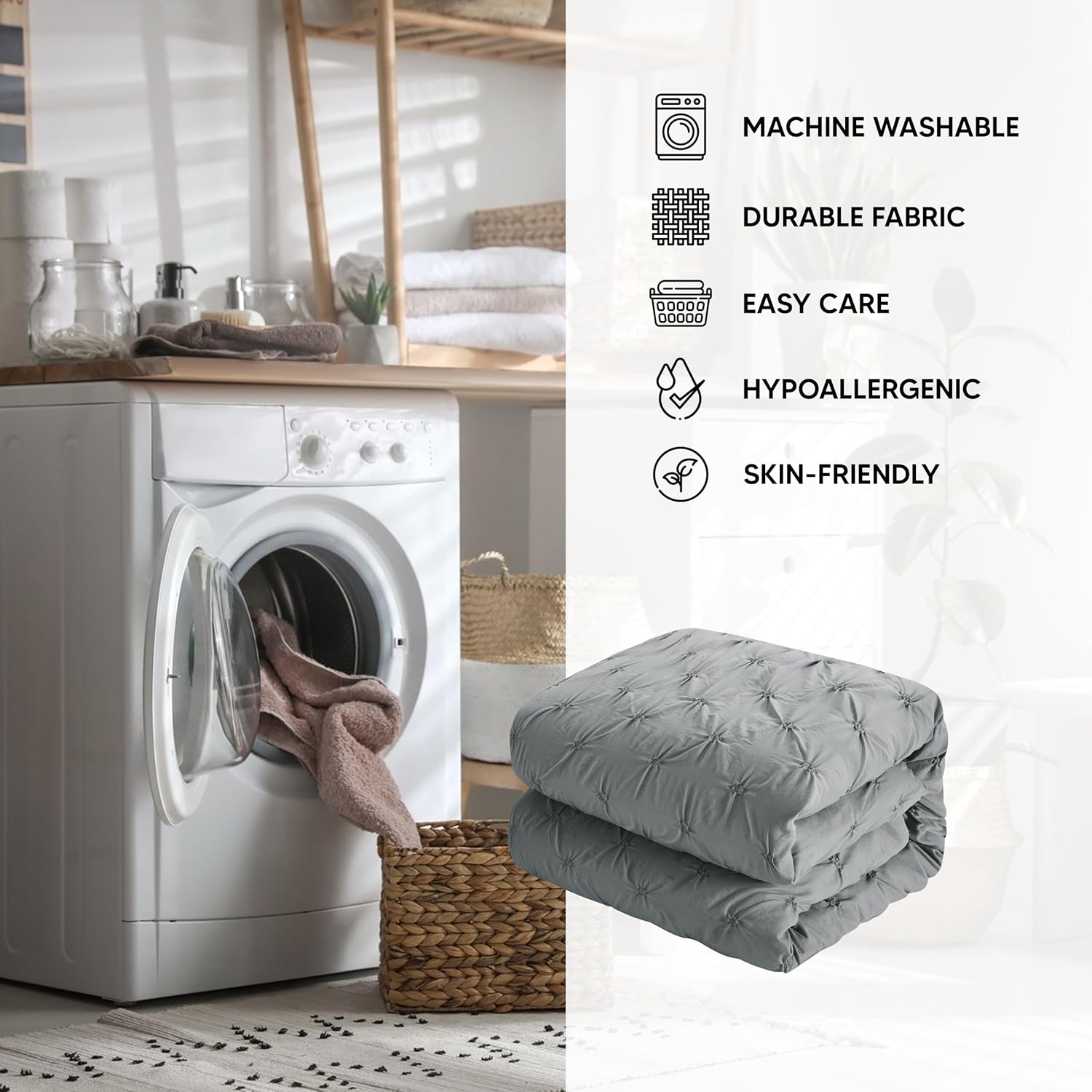 - Queen-size set includes: 1 comforter, 2 pillowcases, 1 decorative pillow