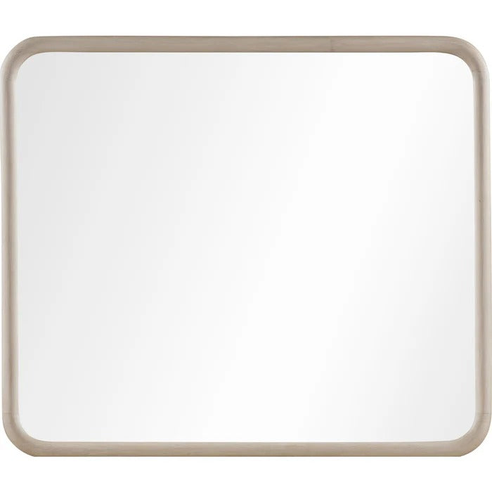 Mirrored glass and solid rubberwood; dresser-mount hardware included; wall-mountable with keyhole brackets (portrait/landscape); 1-inch beveled quarter-inch mirror glass; wire-brushed surfaces; Chai lightly cerused oak finish; rounded rectangle design matches collection.