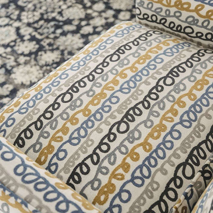 Simplicity is the name of the game with this chair. You'd appreciate the clean lines from the round wooden legs to the rounded armrests lined with welt trim. The back cushions are loose pillows that are easily removed for cleaning. Pops of colorful and playful lines are found on the pillows, giving this chair a friendly and approachable personality--the navy and gold accents popping against the neutral gray linen-like fabric.