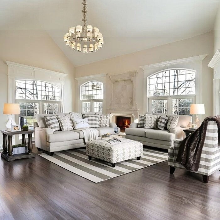This soft patterned ottoman sits atop small tapered wooden legs. Its earth palette pattern serves as a welcome contrast to the bare solid colored furniture, sprucing up the room with some shape and color breaks without breaking the welcoming surroundings.