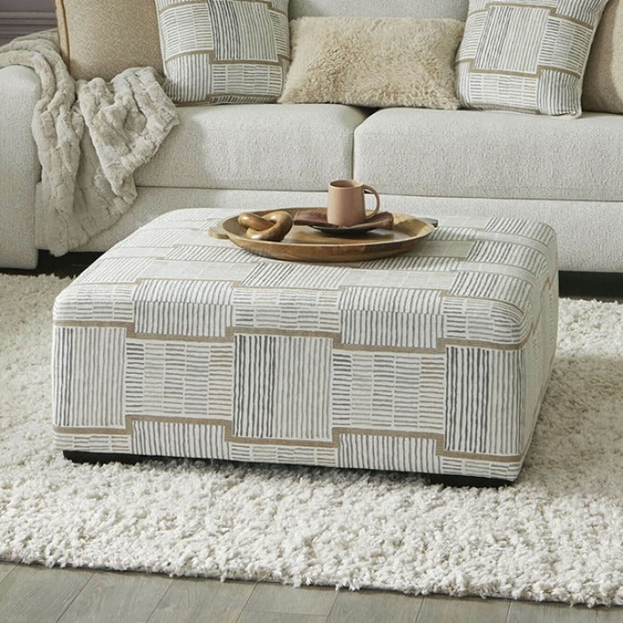 Upholstered in chenille and accented by a variety of beige highlights, this ottoman exudes an aura of warmth and welcome. Chic and brimming in softness, the texture complements the slightly rounded corners perfectly. This matching ottoman feature a distinct line pattern that gives the set enough contemporary appeal.