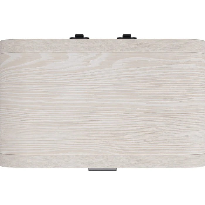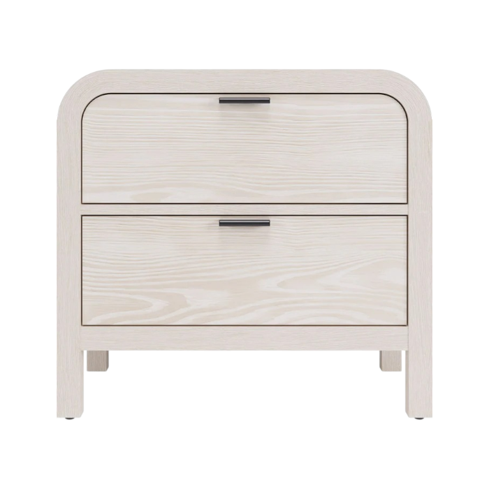 This soft modern collection blends classic minimalist lines with waterfall edges in a striking unexpected arrangement. Ash wood veneer and solid hardwood surfaces are gently wire brushed to enhance the wood's natural texture and finished in a modern white wash for a look that's at once modern, coastal and cottage.