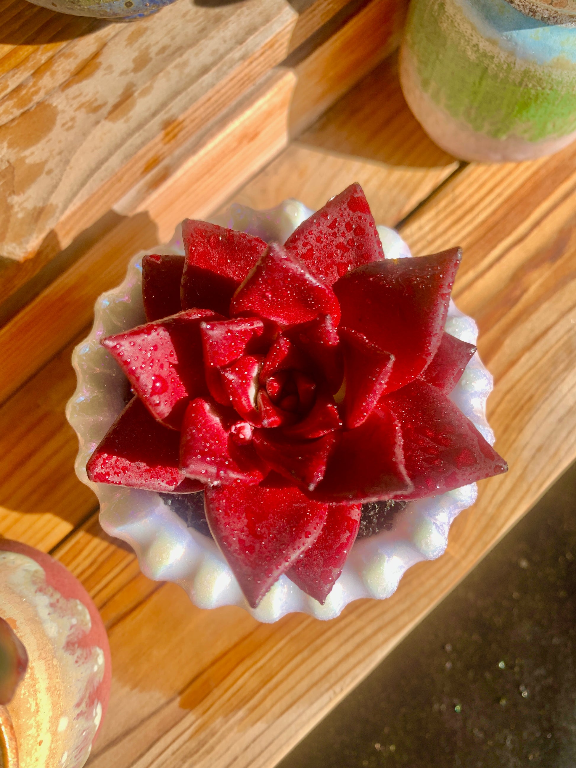 Succulent Plants Introduction - Echeveria agavoides v. Romeo Rubin is a cultivar of Echeveria agavoides. The leaves of Echeveria agavoides v. Romeo Rubin form tight, compact rosettes that grow in a symmetrical pattern. The leaves have a distinctive triangular shape with pointed tips and are known for their intense red coloration. The vibrant red tones of the leaves can vary from deep maroon to bright ruby red, adding a bold and dramatic flair to the plant.