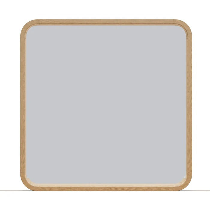 Mahogany solid wood and mirrored glass; dresser-mount hardware; beveled mirror; matte jet-black finish; MDF back; mirror surface 36.5" × 33.5"; rounded modern design.
