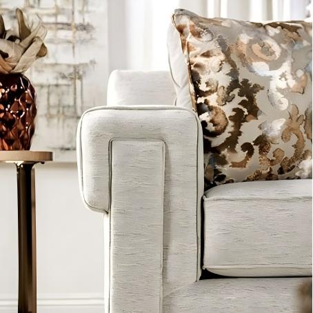 Made in the U.S.A., this gorgeous light gray love seat with uniquely squared-back arms hosts a number of pillows that serve to complement the visual motif most effectively.