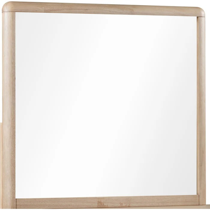 Made from mirrored glass and solid Rubberwood with dresser-mount hardware and keyhole hangers; wire-brushed wood in a Ginger finish; 4 mm beveled mirror glass (36"Γ34").