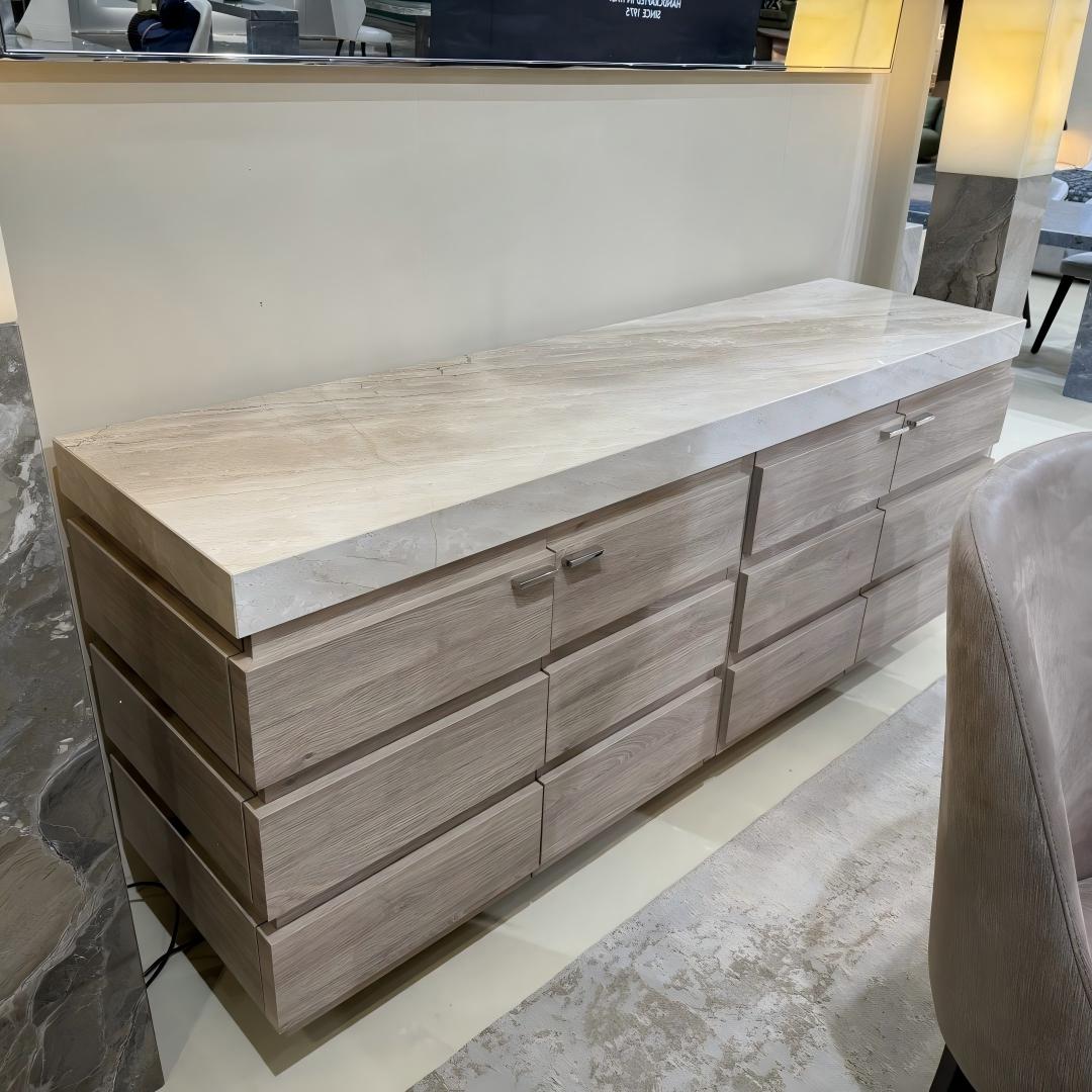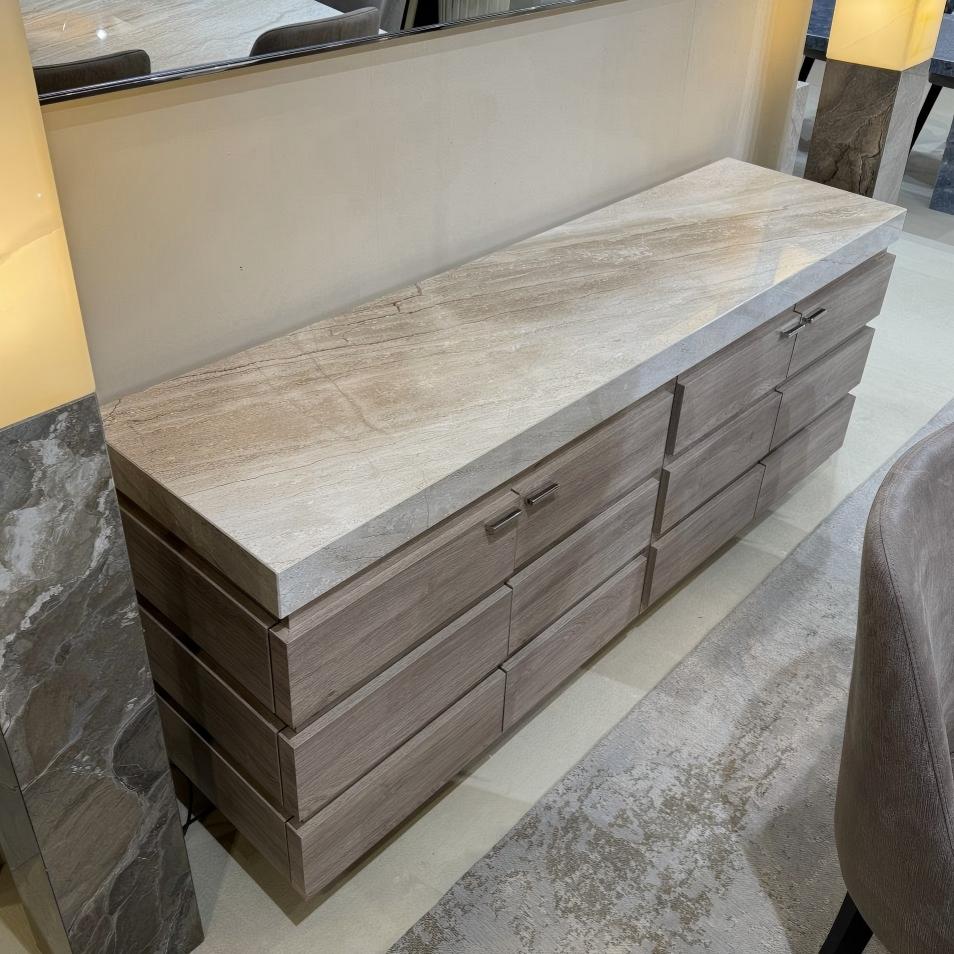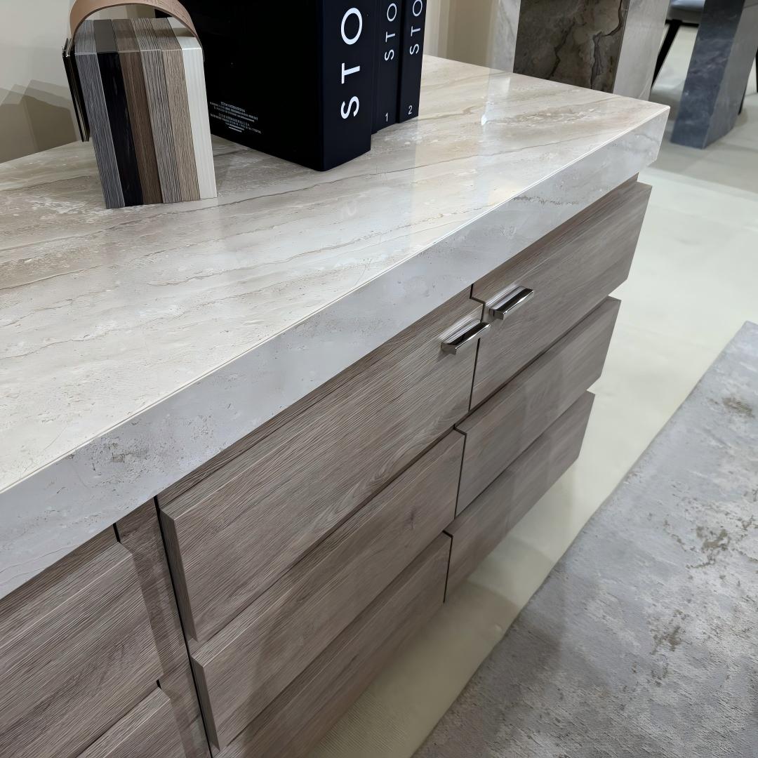 The Gova Collection includes a complete series of dining room furniture products. The dominant motif consists of deep horizontal grooves obtained on the wooden bases for tables and on the doors of the sideboards.