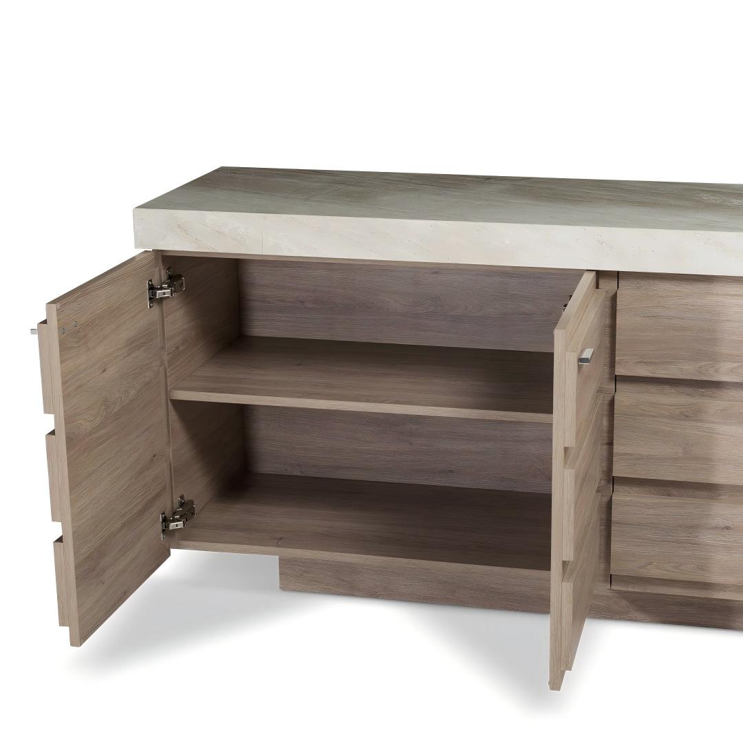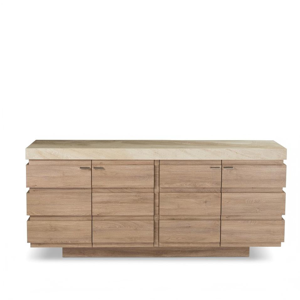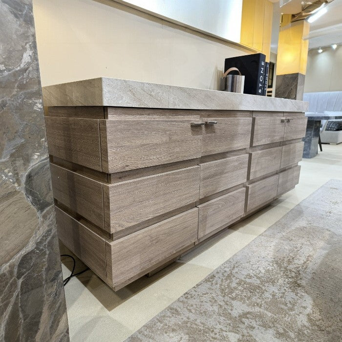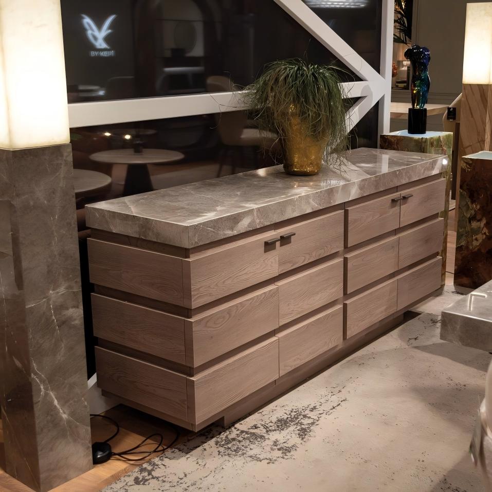 The Gova Collection includes a complete series of dining room furniture products. The dominant motif consists of deep horizontal grooves obtained on the wooden bases for tables and on the doors of the sideboards.