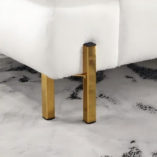 Let this chic and comfy set bring excitement and personality to your living room. Not only is the silhouette fun, inviting, and unique, but the fabric itself is a statement of its own. Bright white boucle fabric wraps around the piece, filling every deep horizontal tuft. Tall tuxedo-like arms and backrest cradle the lengthy bench-style seat cushion between. Gold-plated steel legs is the proverbial cherry on top of this decidedly alluring piece.