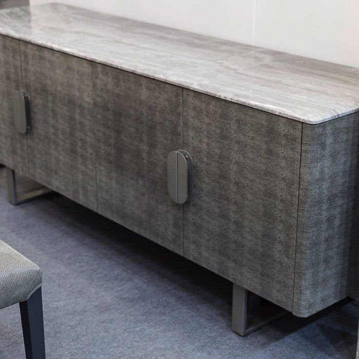 4-Doors buffet with upholstered sides and doors, metal handles and base in polished steel (PS) or any metallic finishes.