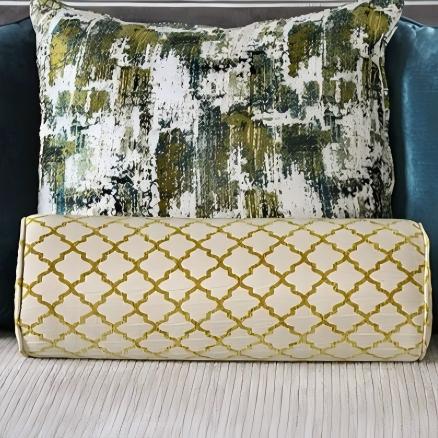Another set that nearly defies description! Gray velvet upholstery, white knit cushions, black wood rounded feet, gleaming nail head trim... not for the lite of heart! It's an eccentric ensemble, complete with a wild assortment of accent pillows.