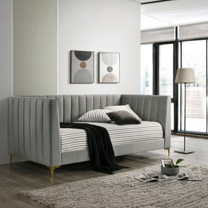 Sophisticated and charming, this light gray daybed is elegantly designed to maximize comfort. It's great for lounging with family and friends in the morning hours, and it's great for a good night's rest as well. The tuxedo-inspired design, with arms as tall as the back, lends a classic look alongside the gold metal legs. It's fully upholstered in padded flannelette for overall softness.Β