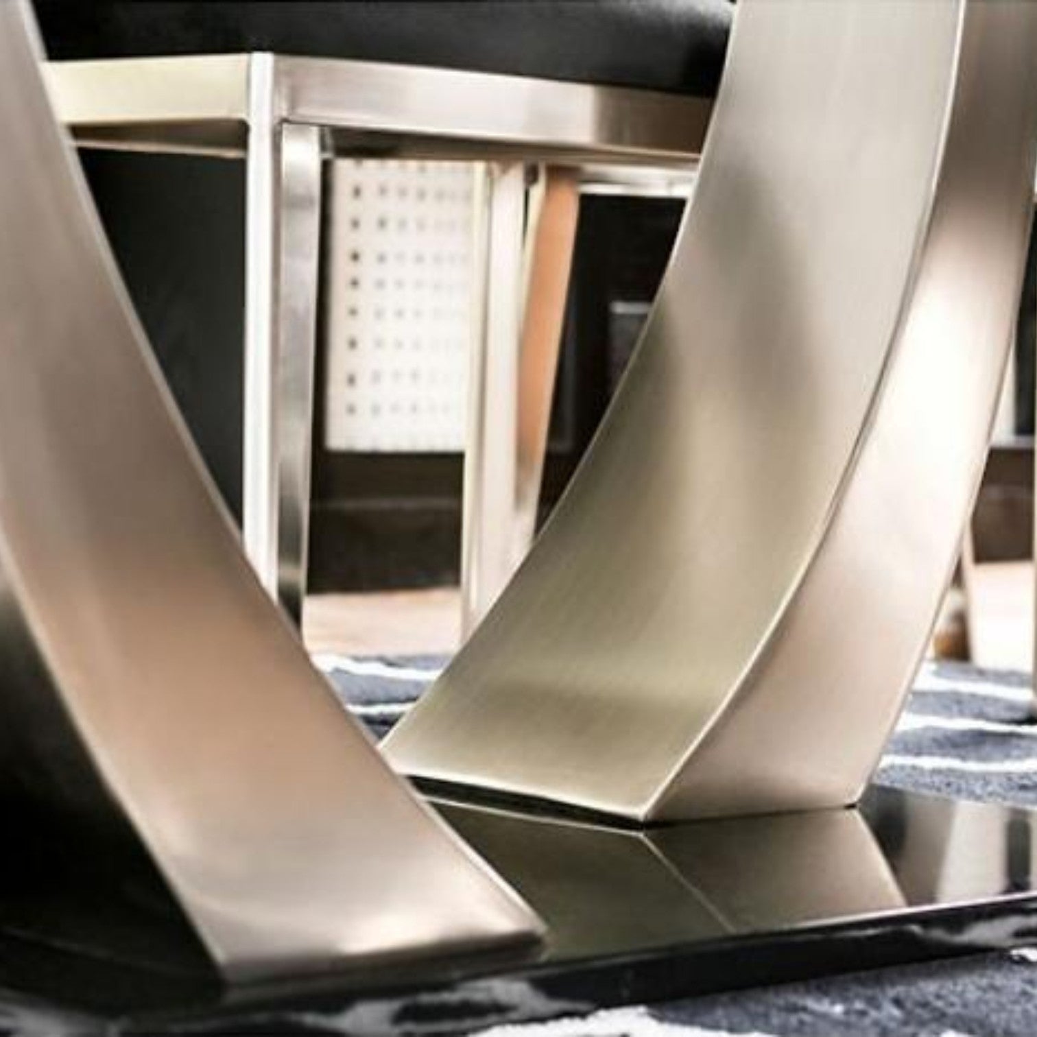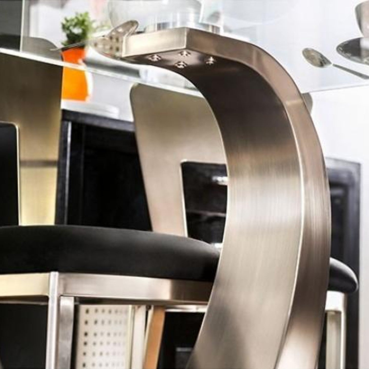 Graceful curves durably support the wide, rectangular glass top. The elliptical metal posts feature beautiful satin plated powder coating, matching the metal chair frames. Relax in style as the padded microfiber cushions offer comfort while the black upholstery complements the black finished base.
