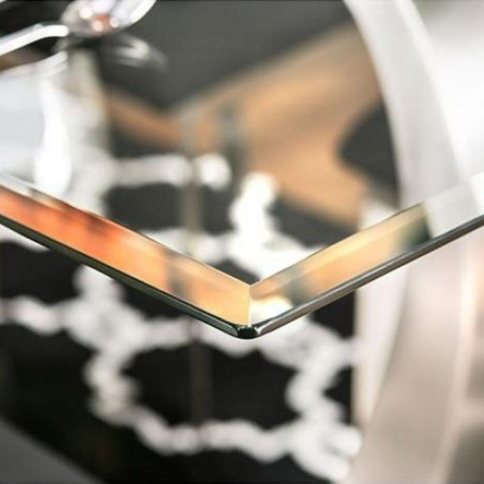 This table features graceful curved supports holding a wide rectangular glass top, anchored by elliptical metal posts with a satin-plated powder-coated finish.