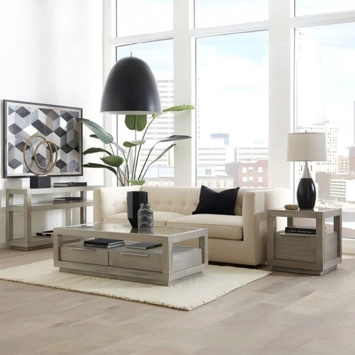 The Oxford collection makes a striking first impression with bold proportions, crisp, modern lines and a weathered finish. Smartly accented with top-mounted nickel plated pulls, tempered glass, and a floating plinth base. Available in Basalt Grey.