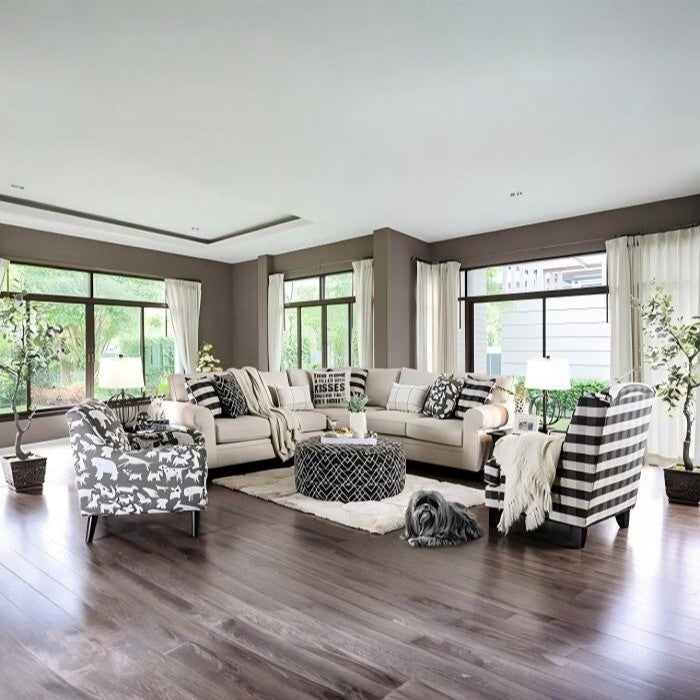 This tall round ottoman enthralls with its geometric pattern. The ivory lives dance across the black upholstering and helps add a sense of height to the piece. The welting trim stands out just enough to add another visual element to the piece.