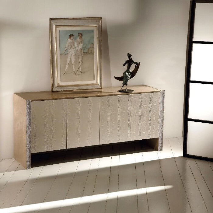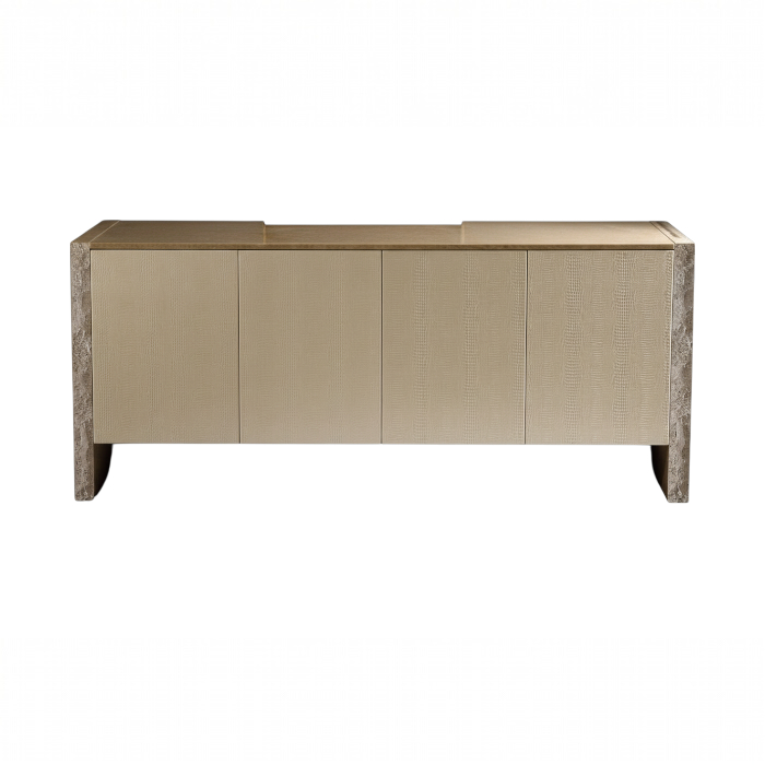 All Romo buffets come with wood or leather doors. All buffets are equipped with a set of wood internal shelves and drawers. Sides come with hand made chiseled edge. Sides and top in any available natural stone finishes.