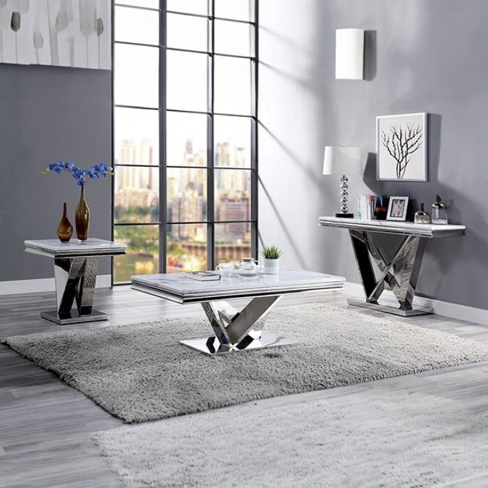 Complete your space with this upscale design. This coffee table look stunning with its faux marble top, which turns out easier to manage and keep clean than their original counterparts. Along the edges are beautiful bevels that blend nicely with the underlying frame. The surface is held up by a unique chrome pedestal made of stainless steel with bevels that reflect light beautifully. The whole structure is supported by a chrome base.