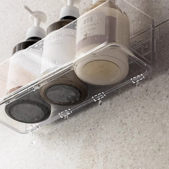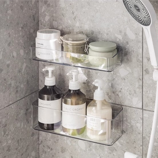 Enhance your bathroom or kitchen organization with this transparent wall-mounted storage shelf, available in three sizes: