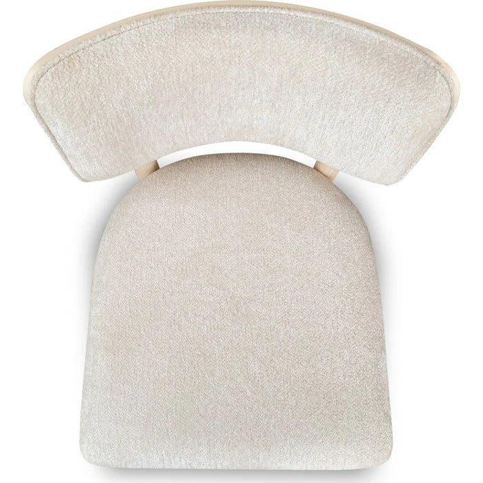 The Zinnia collection blends sophisticated design with ash wood veneer in a white sand finish, highlighting natural grain and subtle color variations. Plush upholstery and soft brass accents complete a stylish, comfortable dining experience.